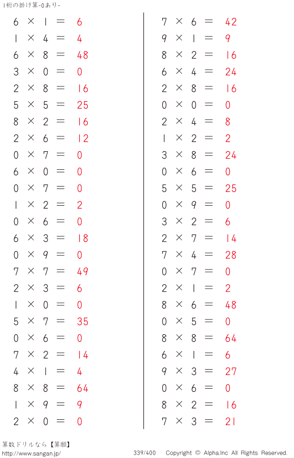 上記のボタンから「1桁の掛け算(0あり)」の算数数学ドリル・計算ドリル(PDFプリント)がダウンロードできます。個人利用は無料です(家庭以外での配布は有料です)。