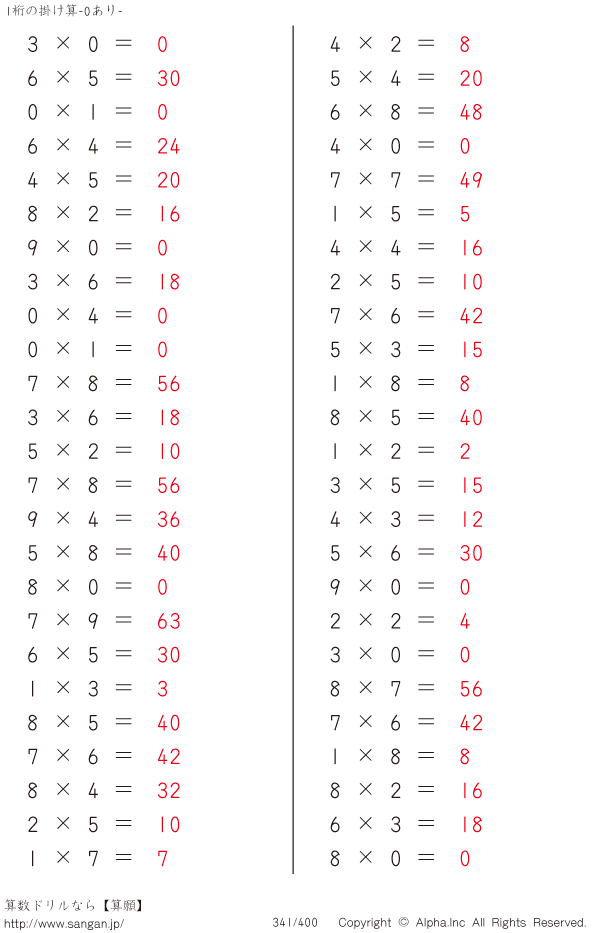 1桁の掛け算(0あり) [解答]341/400