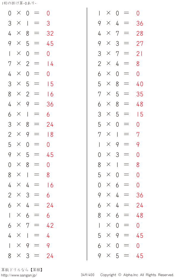 上記のボタンから「1桁の掛け算(0あり)」の算数数学ドリル・計算ドリル(PDFプリント)がダウンロードできます。個人利用は無料です(家庭以外での配布は有料です)。