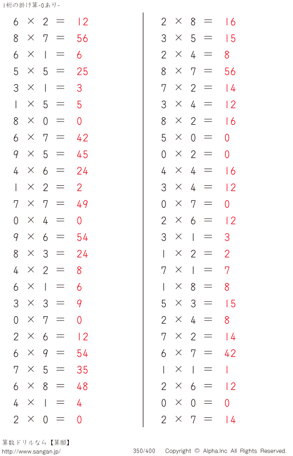 上記のボタンから「1桁の掛け算(0あり)」の算数数学ドリル・計算ドリル(PDFプリント)がダウンロードできます。個人利用は無料です(家庭以外での配布は有料です)。
