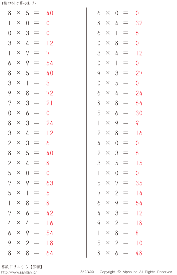 上記のボタンから「1桁の掛け算(0あり)」の算数数学ドリル・計算ドリル(PDFプリント)がダウンロードできます。個人利用は無料です(家庭以外での配布は有料です)。