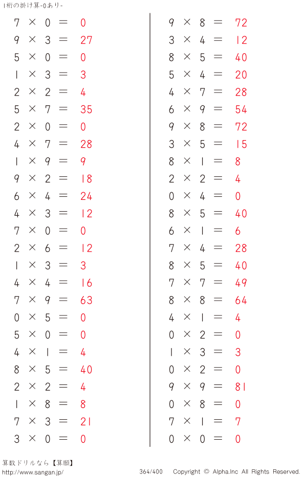 1桁の掛け算(0あり) [解答]364/400