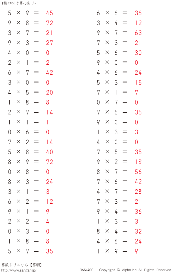 上記のボタンから「1桁の掛け算(0あり)」の算数数学ドリル・計算ドリル(PDFプリント)がダウンロードできます。個人利用は無料です(家庭以外での配布は有料です)。