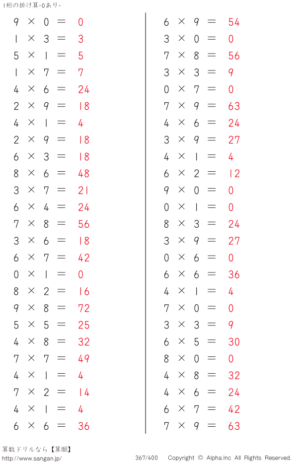 上記のボタンから「1桁の掛け算(0あり)」の算数数学ドリル・計算ドリル(PDFプリント)がダウンロードできます。個人利用は無料です(家庭以外での配布は有料です)。