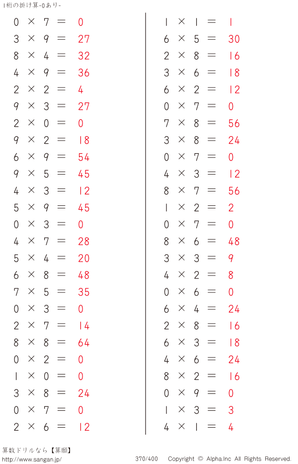 1桁の掛け算(0あり) [解答]370/400