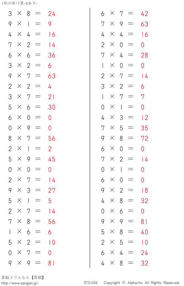 上記のボタンから「1桁の掛け算(0あり)」の算数数学ドリル・計算ドリル(PDFプリント)がダウンロードできます。個人利用は無料です(家庭以外での配布は有料です)。