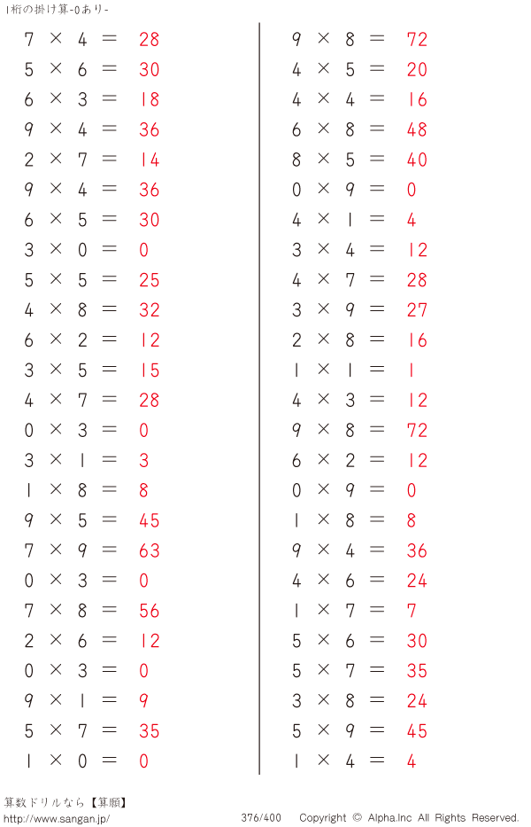 上記のボタンから「1桁の掛け算(0あり)」の算数数学ドリル・計算ドリル(PDFプリント)がダウンロードできます。個人利用は無料です(家庭以外での配布は有料です)。
