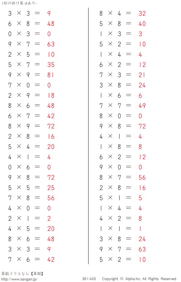 1桁の掛け算(0あり) [解答]381/400