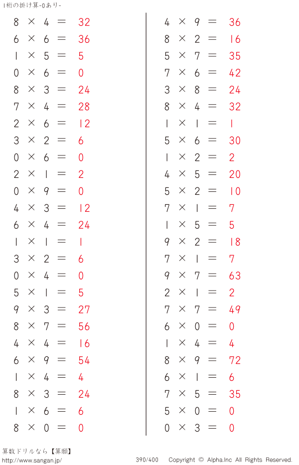 上記のボタンから「1桁の掛け算(0あり)」の算数数学ドリル・計算ドリル(PDFプリント)がダウンロードできます。個人利用は無料です(家庭以外での配布は有料です)。