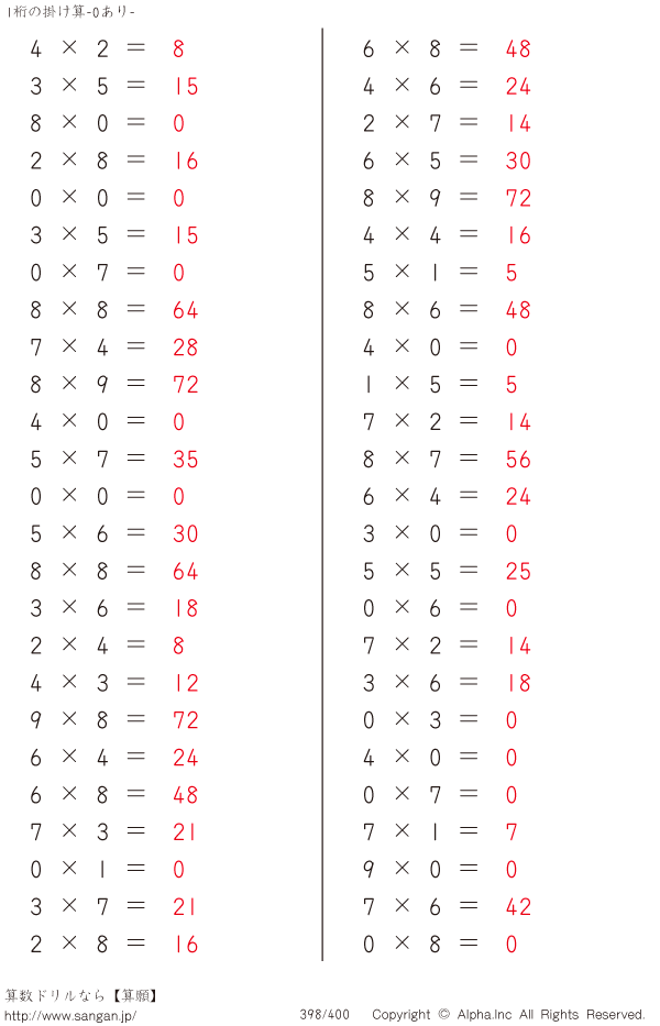 上記のボタンから「1桁の掛け算(0あり)」の算数数学ドリル・計算ドリル(PDFプリント)がダウンロードできます。個人利用は無料です(家庭以外での配布は有料です)。