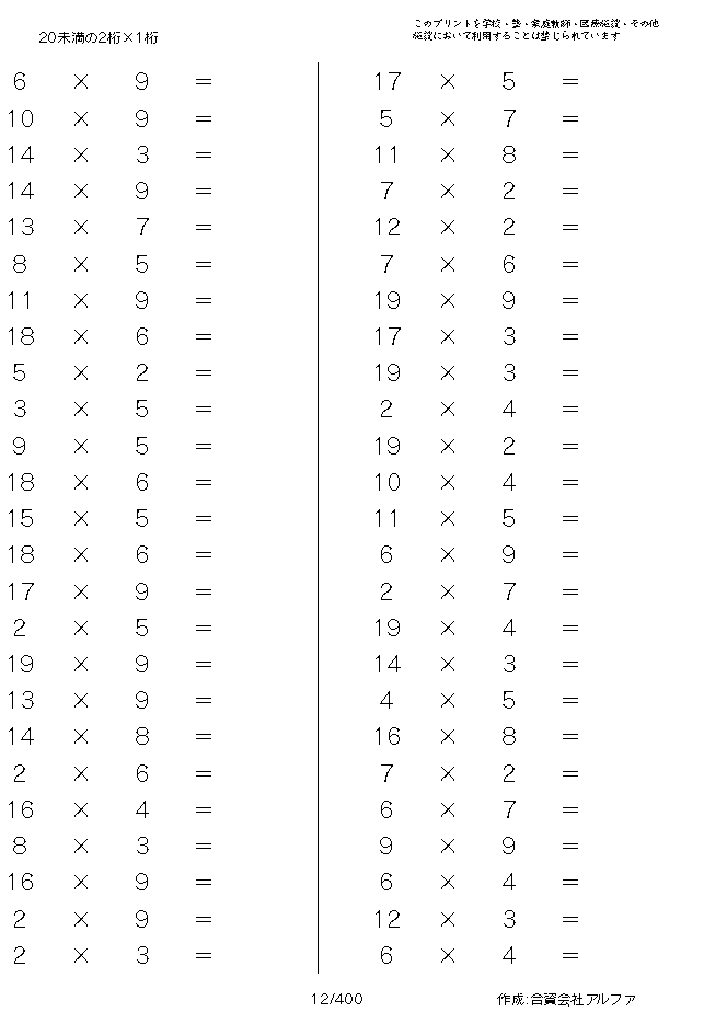 上記のボタンから「20未満の2桁×1桁」の算数数学ドリル・計算ドリル(PDFプリント)がダウンロードできます。個人利用は無料です(家庭以外での配布は有料です)。