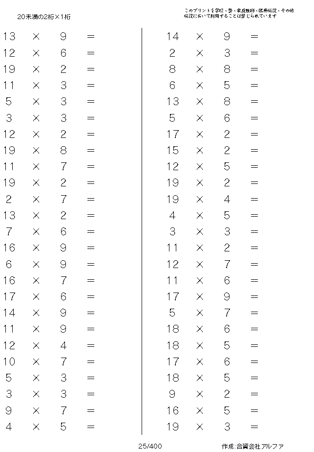 上記のボタンから「20未満の2桁×1桁」の算数数学ドリル・計算ドリル(PDFプリント)がダウンロードできます。個人利用は無料です(家庭以外での配布は有料です)。
