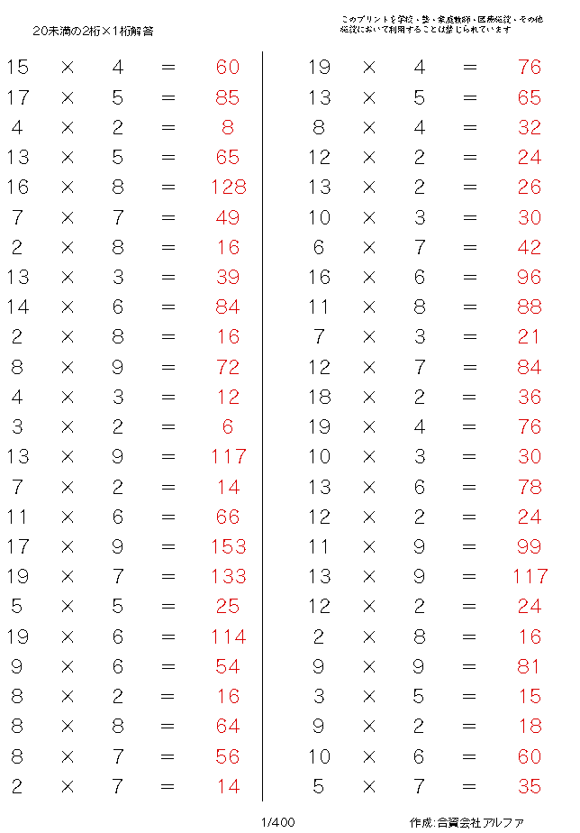 上記のボタンから「20未満の2桁×1桁」の算数数学ドリル・計算ドリル(PDFプリント)がダウンロードできます。個人利用は無料です(家庭以外での配布は有料です)。