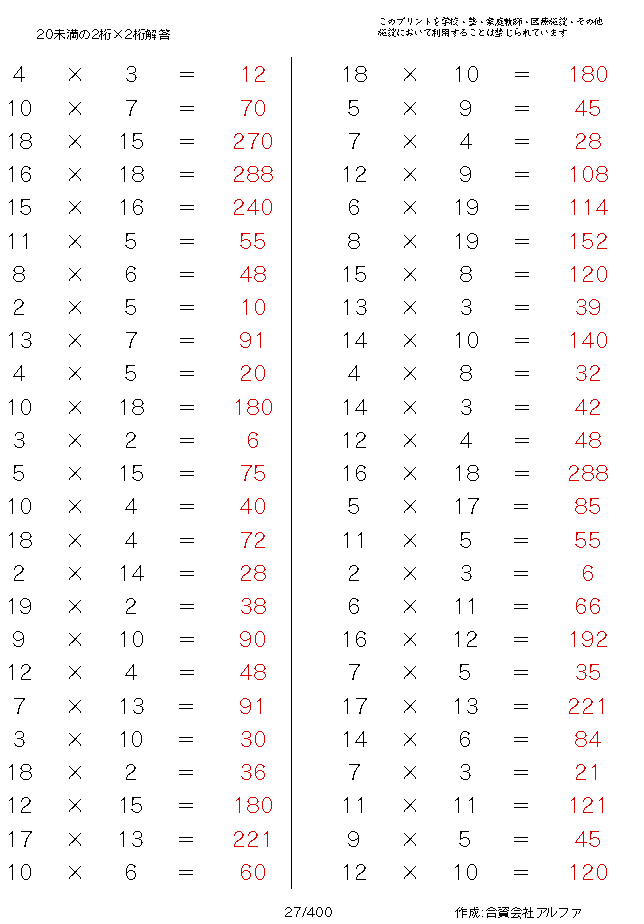 上記のボタンから「20未満の2桁×2桁」の算数数学ドリル・計算ドリル(PDFプリント)がダウンロードできます。個人利用は無料です(家庭以外での配布は有料です)。