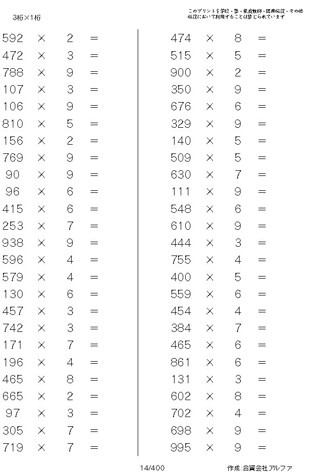 上記のボタンから「3桁×1桁」の算数数学ドリル・計算ドリル(PDFプリント)がダウンロードできます。個人利用は無料です(家庭以外での配布は有料です)。