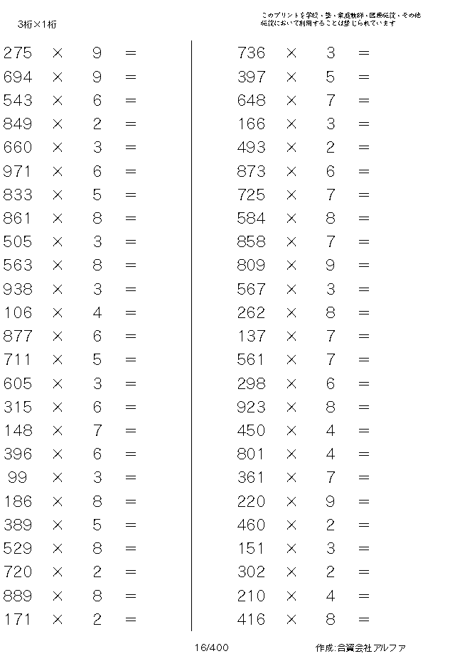 上記のボタンから「3桁×1桁」の算数数学ドリル・計算ドリル(PDFプリント)がダウンロードできます。個人利用は無料です(家庭以外での配布は有料です)。