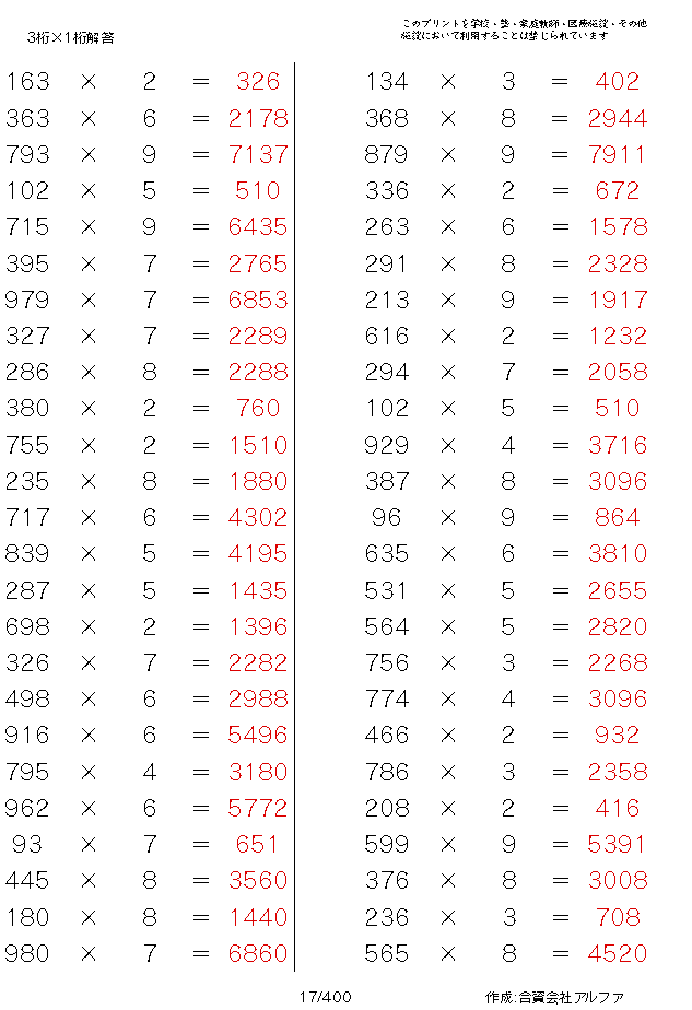 上記のボタンから「3桁×1桁」の算数数学ドリル・計算ドリル(PDFプリント)がダウンロードできます。個人利用は無料です(家庭以外での配布は有料です)。