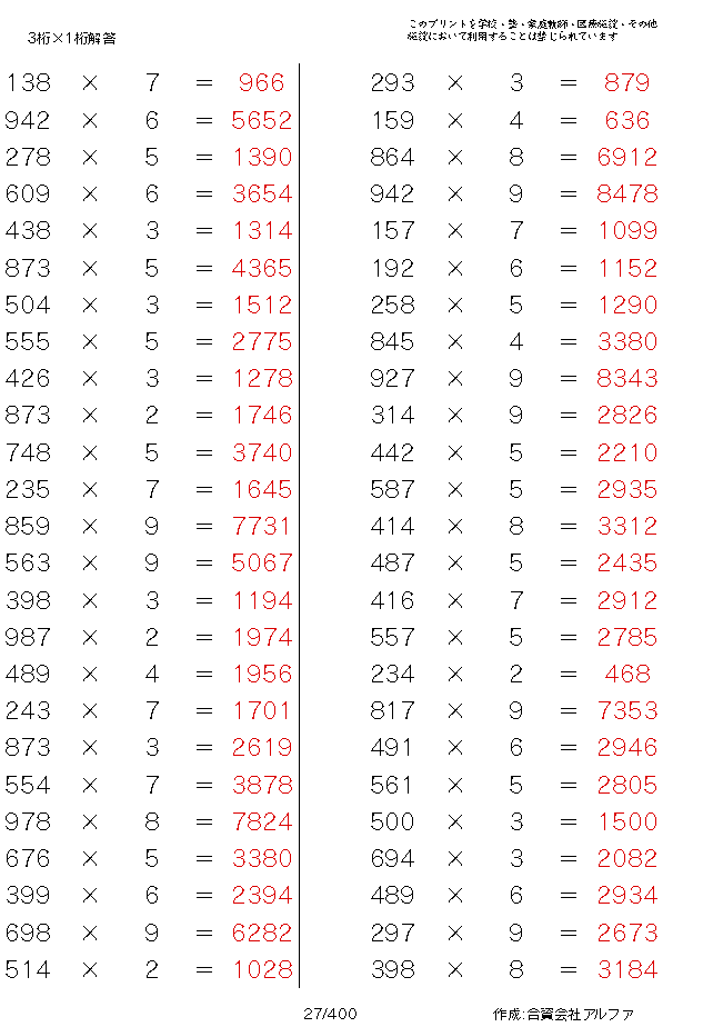 上記のボタンから「3桁×1桁」の算数数学ドリル・計算ドリル(PDFプリント)がダウンロードできます。個人利用は無料です(家庭以外での配布は有料です)。