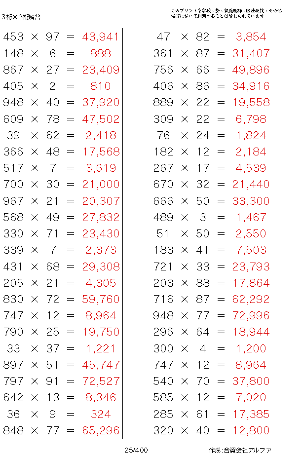 上記のボタンから「3桁×2桁」の算数数学ドリル・計算ドリル(PDFプリント)がダウンロードできます。個人利用は無料です(家庭以外での配布は有料です)。