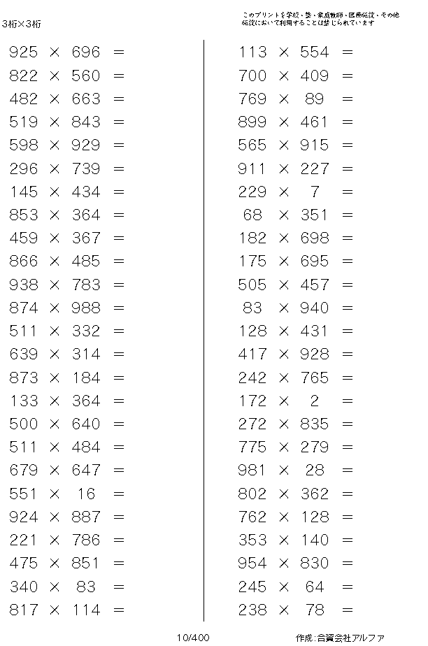 上記のボタンから「3桁×3桁」の算数数学ドリル・計算ドリル(PDFプリント)がダウンロードできます。個人利用は無料です(家庭以外での配布は有料です)。