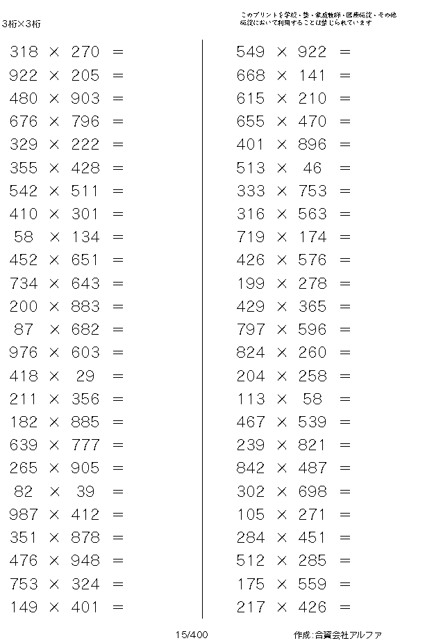 上記のボタンから「3桁×3桁」の算数数学ドリル・計算ドリル(PDFプリント)がダウンロードできます。個人利用は無料です(家庭以外での配布は有料です)。