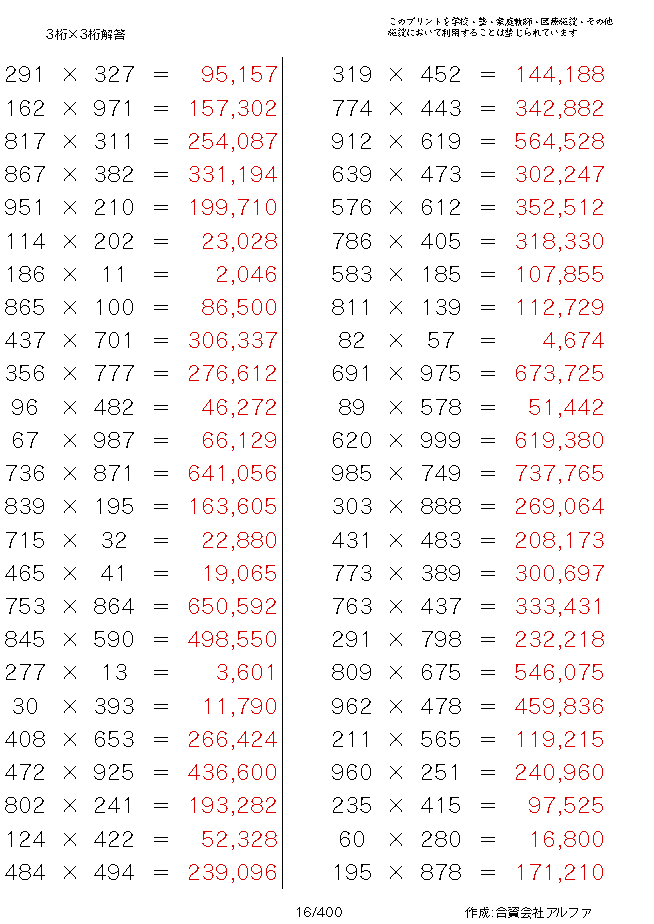 上記のボタンから「3桁×3桁」の算数数学ドリル・計算ドリル(PDFプリント)がダウンロードできます。個人利用は無料です(家庭以外での配布は有料です)。