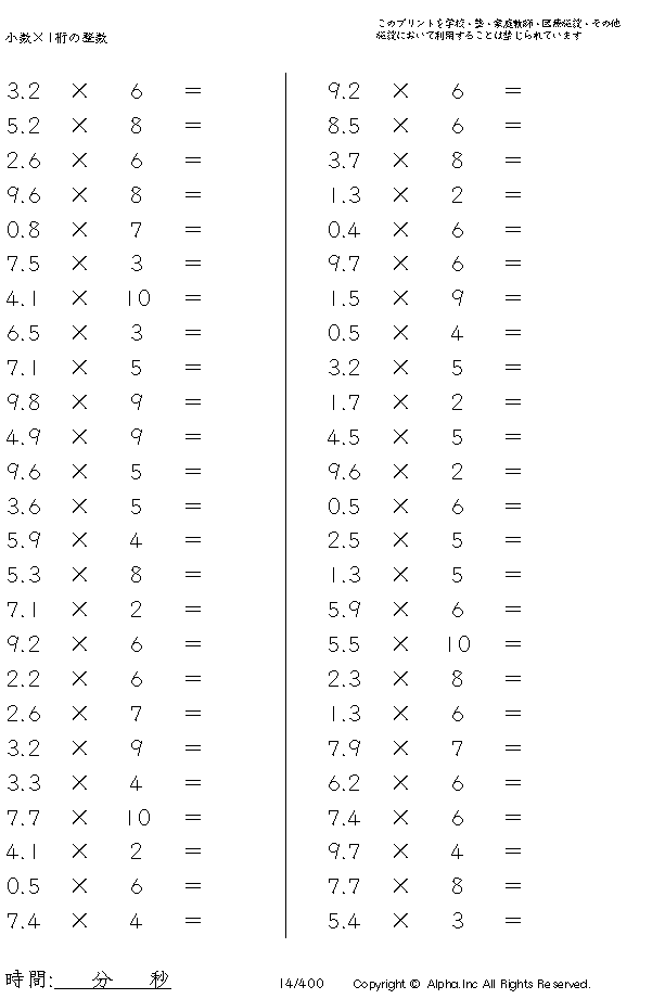 上記のボタンから「小数×1桁の整数」の算数数学ドリル・計算ドリル(PDFプリント)がダウンロードできます。個人利用は無料です(家庭以外での配布は有料です)。