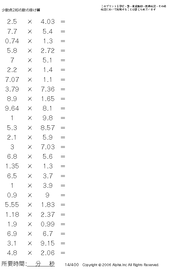 上記のボタンから「小数点2桁の数の掛け算」の算数数学ドリル・計算ドリル(PDFプリント)がダウンロードできます。個人利用は無料です(家庭以外での配布は有料です)。