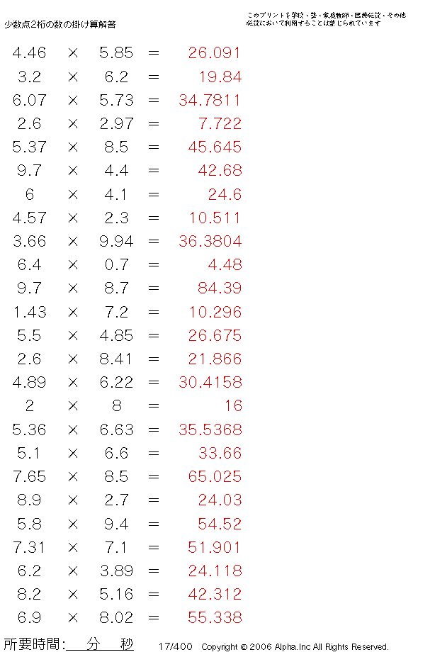 上記のボタンから「小数点2桁の数の掛け算」の算数数学ドリル・計算ドリル(PDFプリント)がダウンロードできます。個人利用は無料です(家庭以外での配布は有料です)。