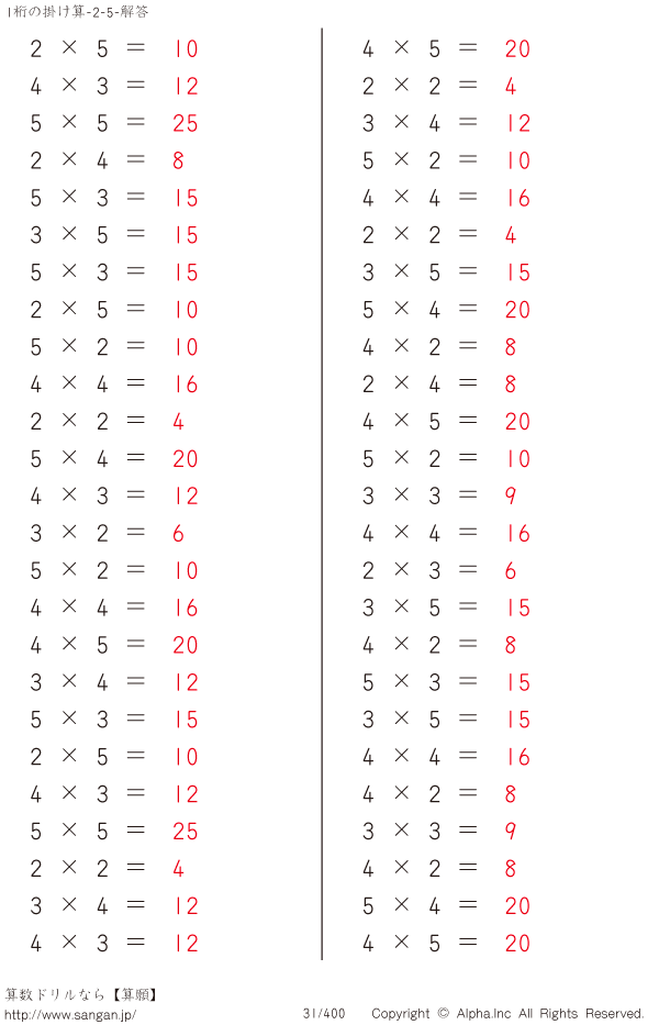 1桁の掛け算九九(5まで) [解答]031/400