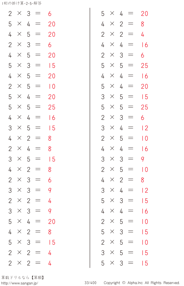 1桁の掛け算九九(5まで) [解答]033/400