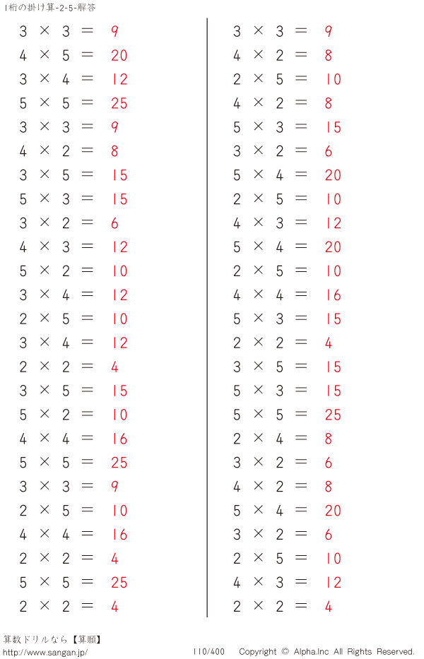 1桁の掛け算九九(5まで)の問題解答ガイド