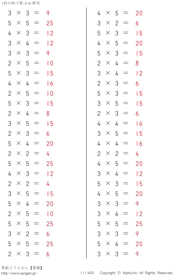 1桁の掛け算九九(5まで)の問題解答ガイド