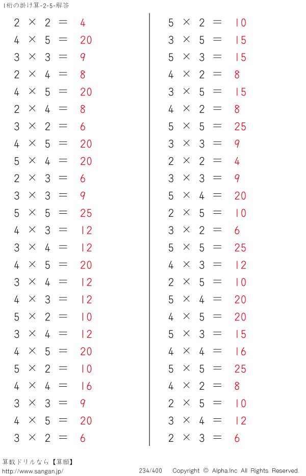 1桁の掛け算九九(5まで)の問題解答ガイド