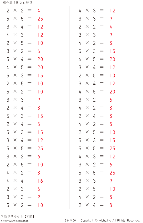 1桁の掛け算九九(5まで) [解答]344/400