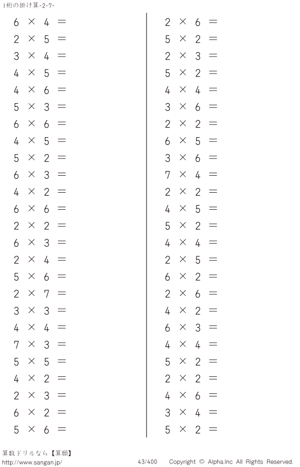 上記のボタンから「1桁の掛け算九九(7まで)」の算数数学ドリル・計算ドリル(PDFプリント)がダウンロードできます。個人利用は無料です(家庭以外での配布は有料です)。