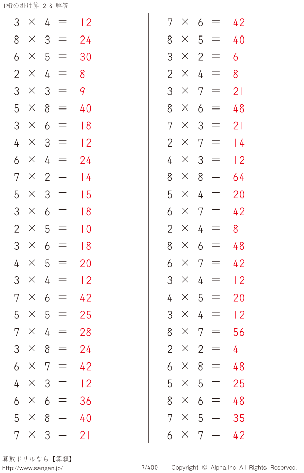 1桁の掛け算九九(8まで)の問題解答ガイド