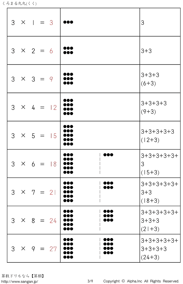 上記のボタンから「くろまる九九の表」の算数数学ドリル・計算ドリル(PDFプリント)がダウンロードできます。個人利用は無料です(家庭以外での配布は有料です)。