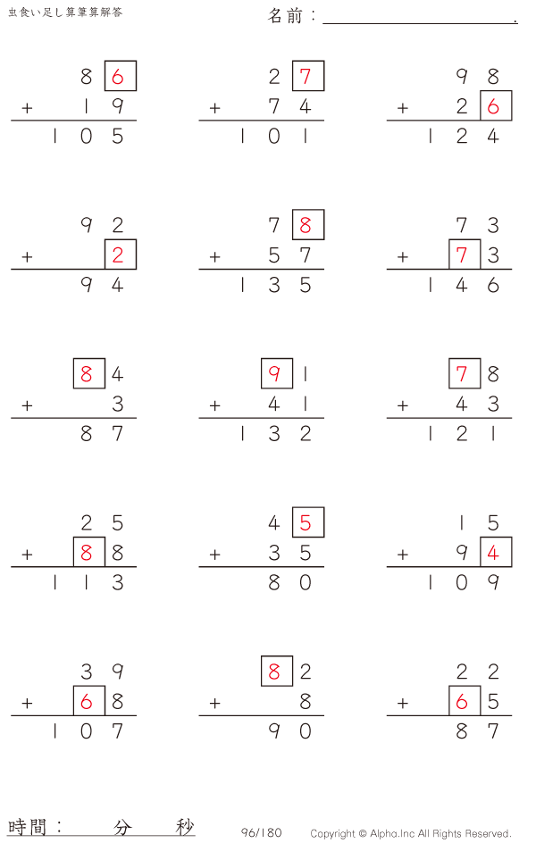 虫食い・2桁+2桁の筆算1 [解答]096/180
