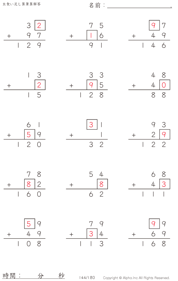 虫食い・2桁+2桁の筆算1 [解答]144/180
