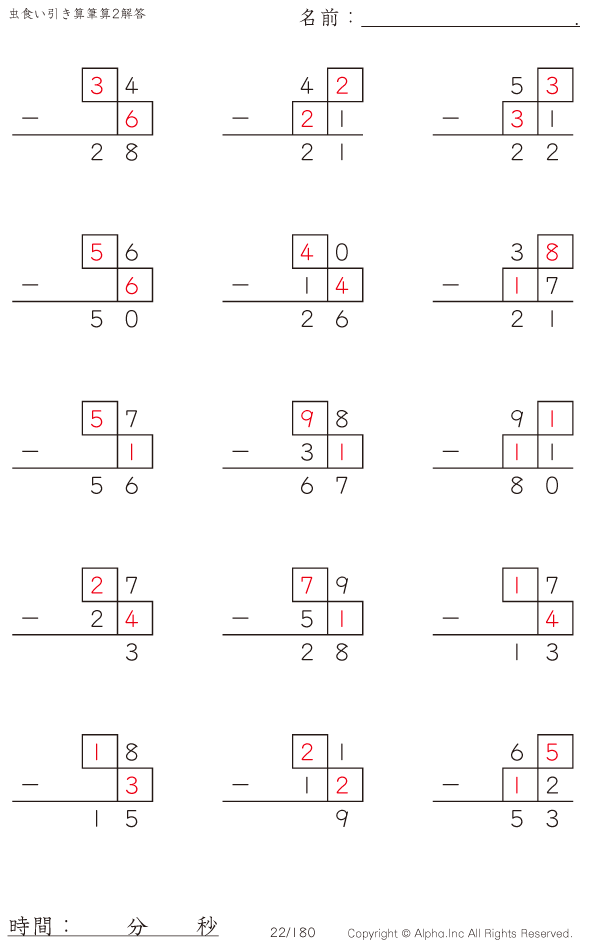 虫食い・2桁-2桁の筆算2 [解答]022/180