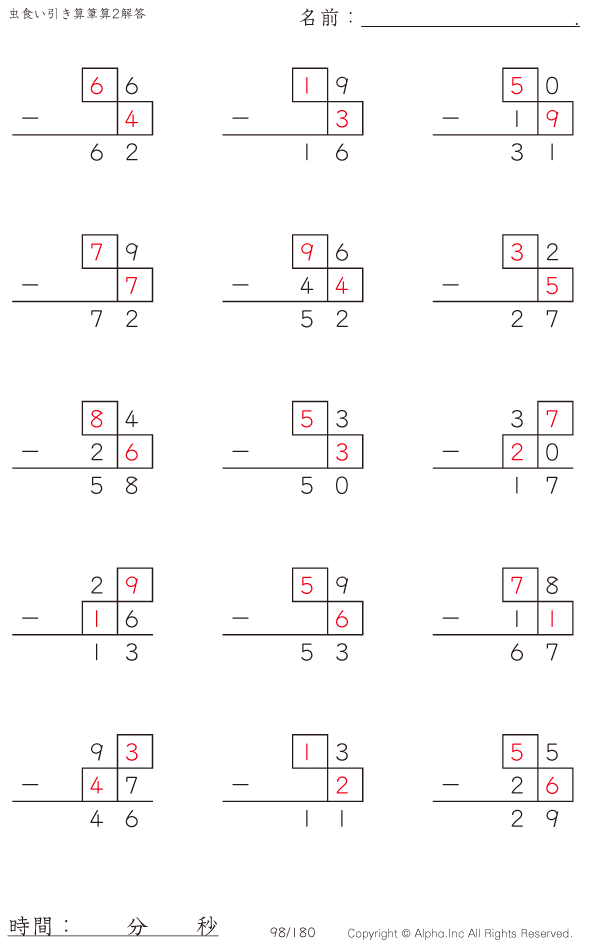 虫食い・2桁-2桁の筆算2 [解答]098/180