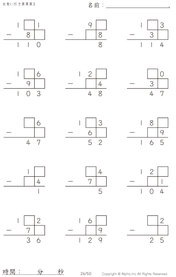 虫食い・3桁-2桁の筆算1(199まで) [問題]026/050
