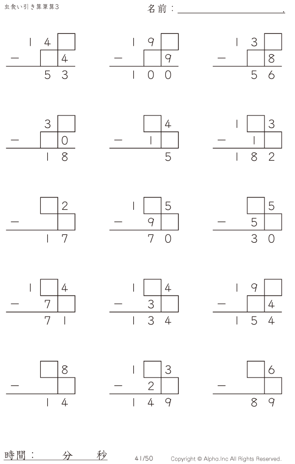 虫食い・3桁-2桁の筆算1(199まで) [問題]041/050