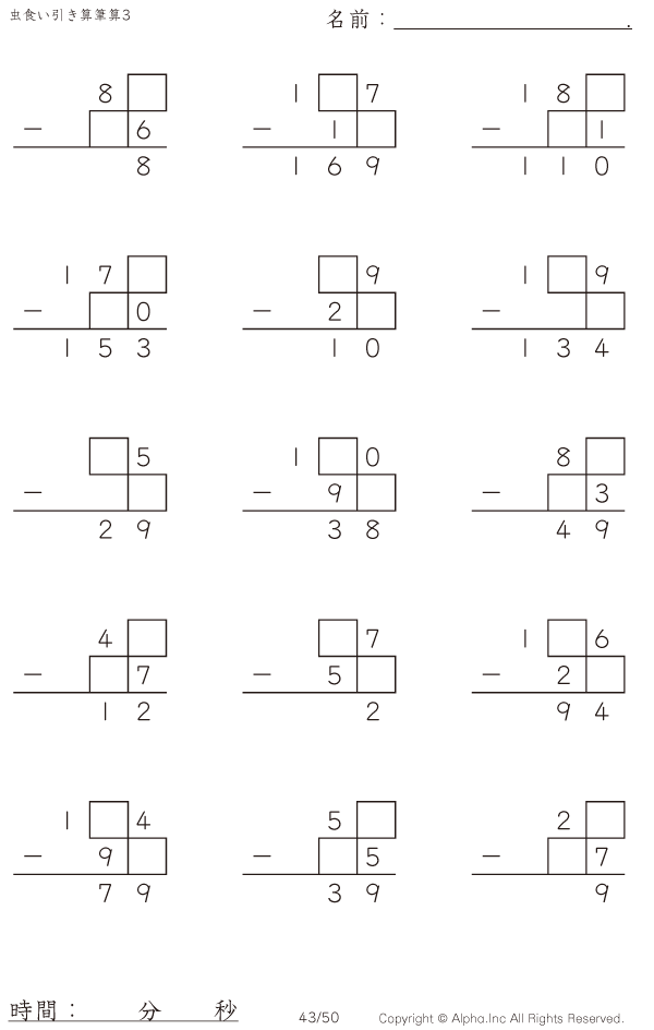 虫食い・3桁-2桁の筆算1(199まで) [問題]043/050