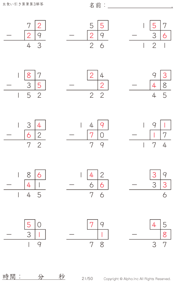 虫食い・3桁-2桁の筆算1(199まで) [解答]021/050