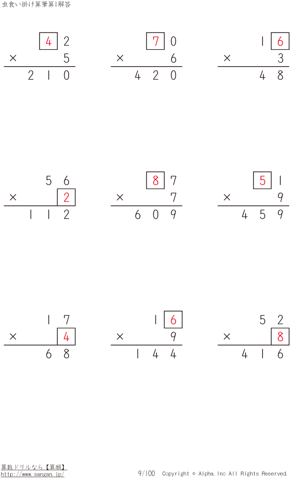 虫食い・2桁×1桁の筆算 [解答]009/100