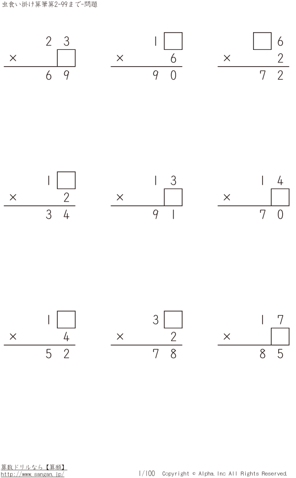 虫食い・2桁×1桁の筆算(解が99まで) [問題]001/100