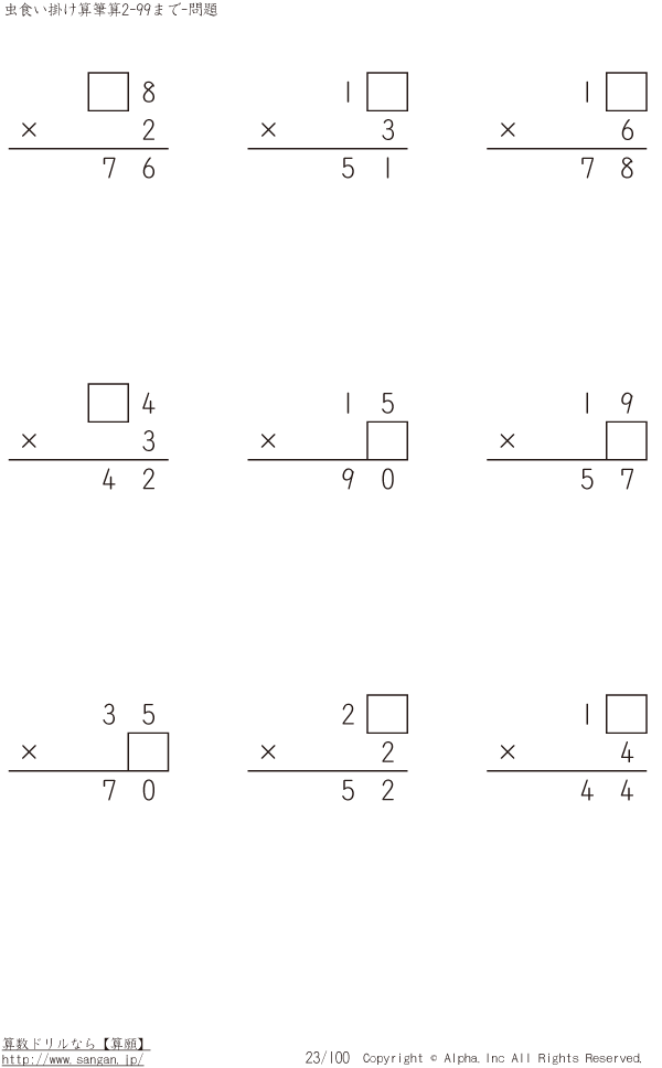 虫食い・2桁×1桁の筆算(解が99まで) [問題]023/100