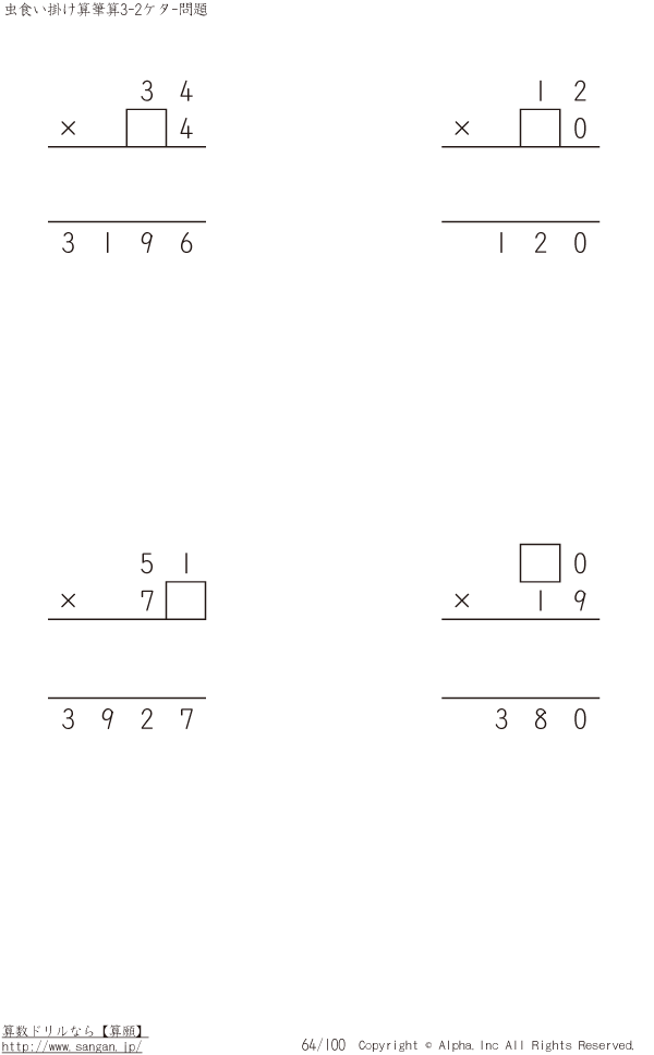 上記のボタンから「虫食い・2桁×2桁の筆算」の算数数学ドリル・計算ドリル(PDFプリント)がダウンロードできます。個人利用は無料です(家庭以外での配布は有料です)。